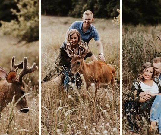 กวางเห็นคู่รักมาถ่ายรูปใกล้ๆ มันจึงขอเข้าร่วมเฟรมด้วย แถมแย่งช่อดอกไม้เจ้าสาวมาอีก