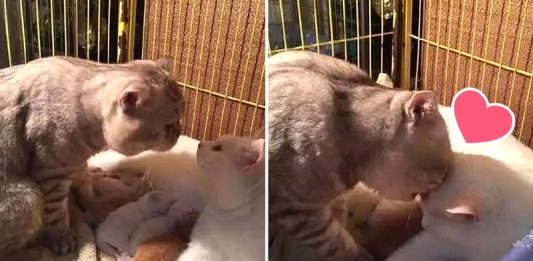 แม่แมวอ่อนเพลียจากการคลอดลูก พ่อแมวจึงเข้าไปหา และมอบความรักให้