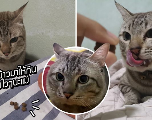 แมวเหมียวเป็นห่วง คาบอาหารเม็ดมาให้ทาสถึงเตียง ส่งความหวังดีให้ทาสหายป่วยไวๆ
